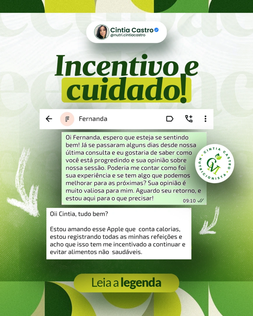 A Fernanda destaca o quanto o incentivo, a presença e as ferramentas corretas fizeram diferença no seu processo. Ao registrar suas refeições e acompanhar suas escolhas, ela passou a ter mais consciência alimentar e motivação para manter o foco.